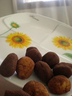Retirar com ajuda de uma colher pequenas porções e fazer uma bolinha, dando uma ligeira achatada (tamanho de bolinha de gude).