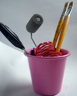 …e me dando conta que esta onda rosa está mais grudada em mim do que pode parecer, porque até o cachepô que uso para apoiar meus pincéis é rosa, além do kit de jardinagem! Será que preciso ser internada? Uma beijoca!