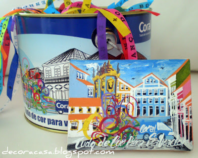 Dentro uma tela do Pelourinho, várias outras fitas coloridas e o release da ação “Tudo de cor para você” sobre a pintura do Pelô que nomeia as cores utilizadas. Para quem quiser as cores do Pelourinho em casa, as dicas são: Essência de Jade, Hera, Conhaque, Estrela Diurna, Beijo Solar, Dia Feliz e Azul Índigo.