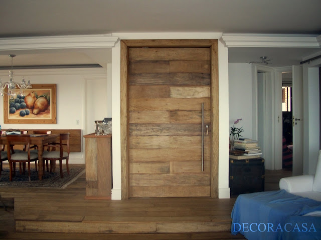 E este é o resultado final: a porta de entrada grande, pivotante feita em peroba de demolição. A guarnição da porta também é de peroba e ela fica em destaque com a finalização da sanca em gesso no teto.