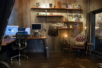 Olha que maravilha este escritório todo rústico, em madeira, mas sem ser sisudo.