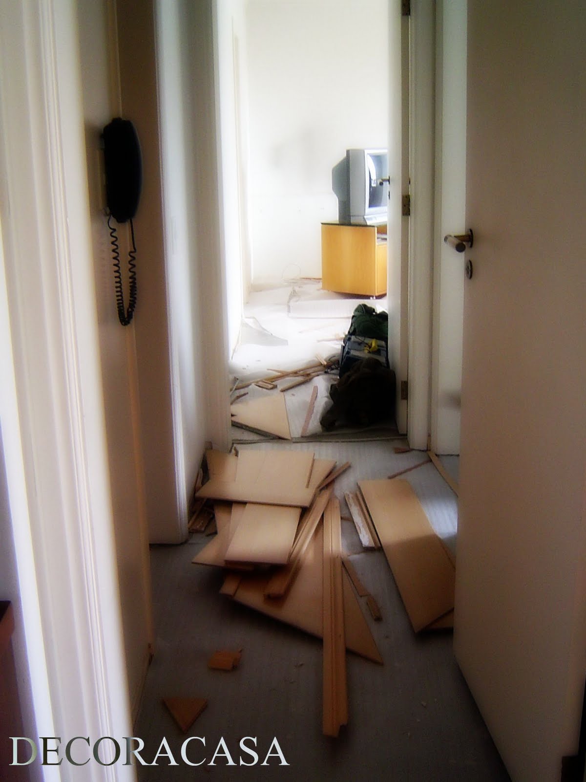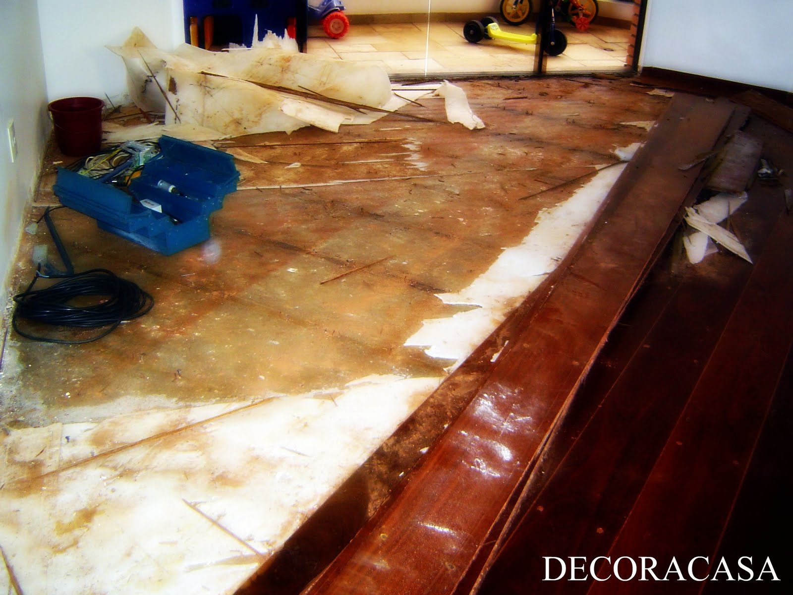 Alguns cálculos na cabeça e disposição chego à conclusão de que o assoalho que estava em minha sala quase conseguiria cobrir os quartos e nossa sala de TV. Ou seja, eu tinha que reaproveitar o mesmo assoalho em minha própria casa.