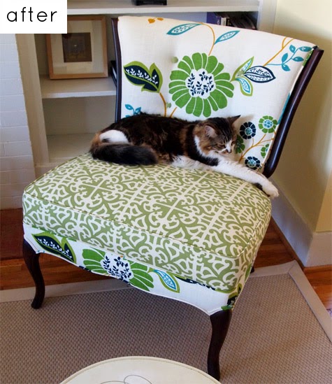 Depois: tecidos com estampas ousadas, mas que se conversam dão um ar contemporâneo para a cadeira.