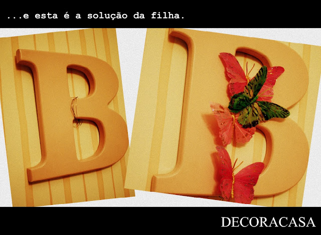 “Quero colocar as borboletas nas letras que estão na parede. Podemos colar com cola quente, você mexe na cola, mas eu mostro onde elas devem ficar.“