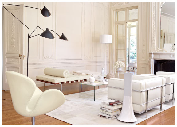 Esta é uma das minhas favoritas: os móveis modernos, de linhas limpas convivendo com a parede clássica francesa