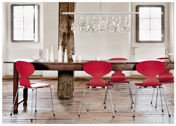 As cadeiras moderníssimas, leves e vermelhas, dialogando super bem com a mesa pesada e rústica