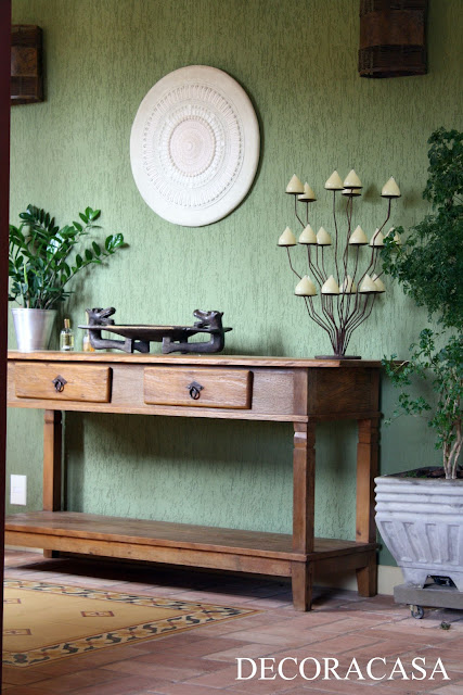 Lógico que o aparador de madeira de demolição, o piso de tijolos e o tapete de ladrilhos hidráulicos conversam perfeitamente e me deixaram apaixonada. Mas a mandala, com sua cor unica e forma circular arremata e une todos os elementos de forma harmoniosa. Transpirando calma, tranqüilidade e recepção, pois o hall é o lugar de se dizer “bem vindos”.