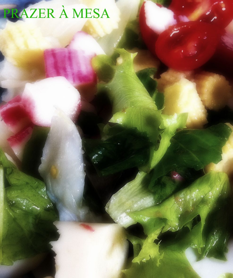 Em um prato, disponha as folhas de alface inteiras, formando uma caminha. Pique as cebolinhas, o kani, o palmito, os tomates e os milhinhos.