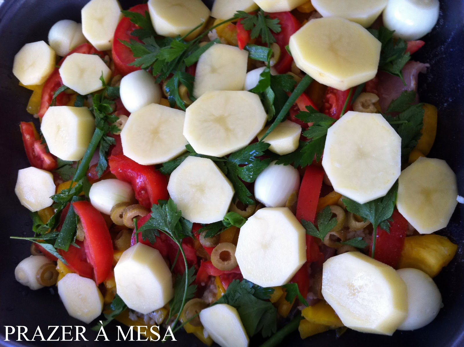Em uma travessa, coloque o frango cortado em tiras de 2 cm e tempere-o com bastante alho picado, espalhando no fundo do recipiente. Comece a dispor todos os ingredientes em camadas, por cima do frango, começando pelo pimentão picado, a cebola em fatias, a batata em fatias, as azeitonas picadas, os tomates fatiados, a salsinha e a cebolinha.