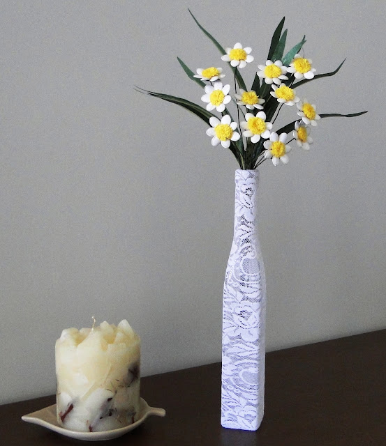Ao invés de colar, apenas costurei a renda em forma de tubo e vesti uma garrafinha.