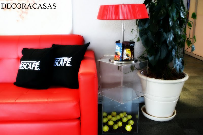 Dois cubos de acrílico que acomodam harmonicamente um abajur vermelho (para combinar com o sofá) e os produtos na base.