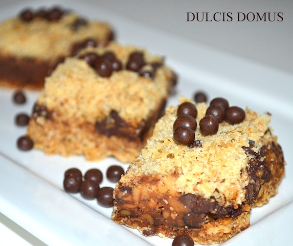 Espalhe os pedaços de chocolate e as pecãs sobre a farofa prensada. Faça o caramelo e acrescente ao final o leite, mexendo até misturar. Despeje imediatamente sobre o chocolate e as pecãs. Cubra com o restante da farofa e leve ao forno por 20 a 25 minutos (deve ficar ligeiramente dourado).