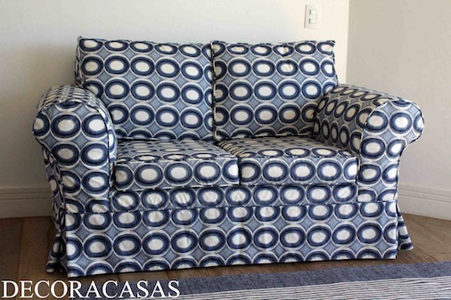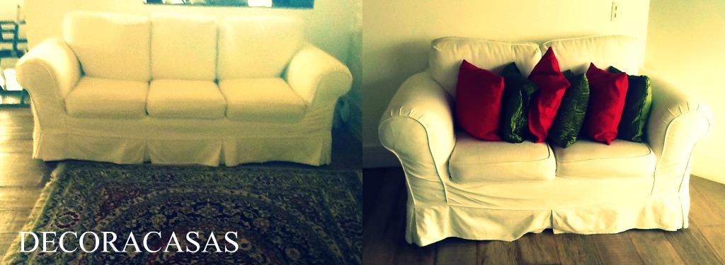 O conjunto de sofás de 3 e 2 lugares foi arrematado da cunhada. Eram revestidos em chenille bege, com uma capa de sarja também bege que eu havia alvejado na máquina de casa em 2008 (e mostrado em
