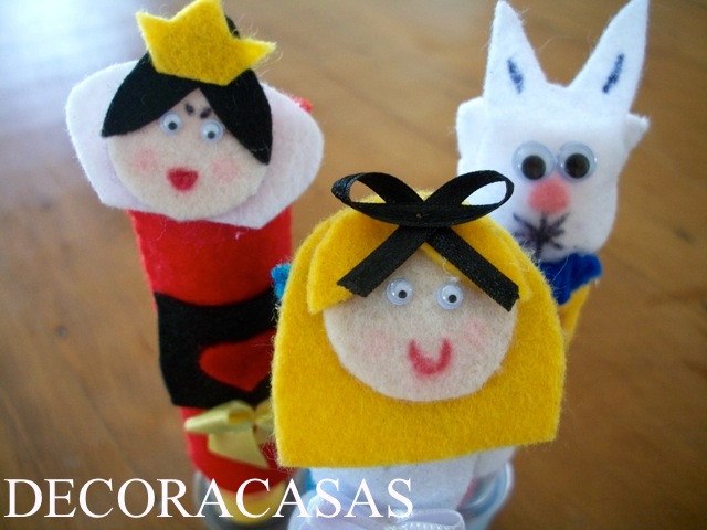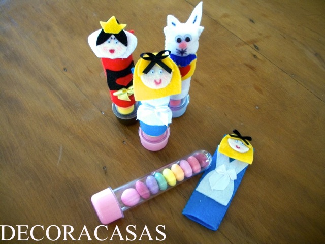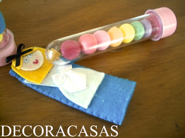 Os “tubos de ensaio” repletos de guloseimas tinham capas confeccionadas em feltro ilustrando cada personagem: a parte externa era delicadamente costurada à mão, enquanto que os adereços e fisionomias eram fixados com cola quente. Muitos deles decoravam a mesa do bolo e promoviam um super visual,