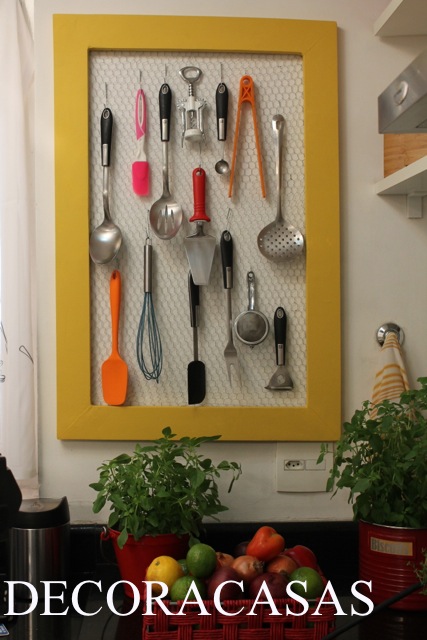 Organizador de tela de galinheiro: este é muito bacana, ocupa pouquíssimo espaço e quebra o maior galho ao acomodar estes utensílios grandes.