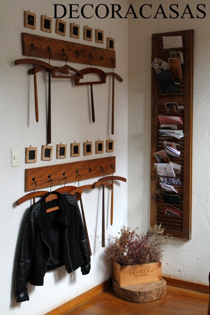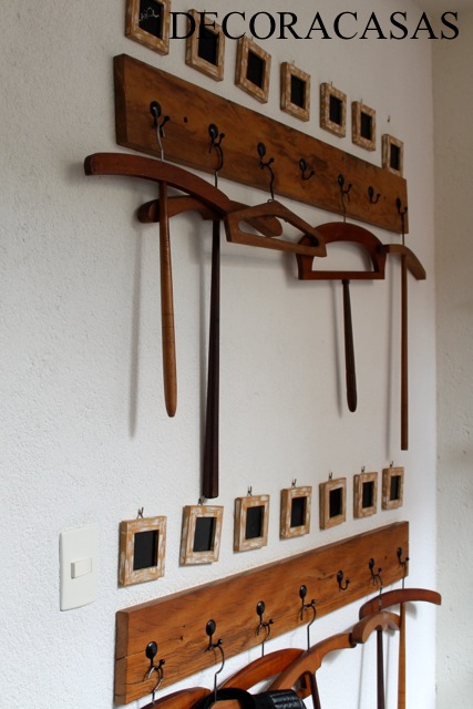 O primeiro projeto que colocarei em prática com certeza será o deste cabideiro: a estrutura é simples, assim como os ganchos. O charme em definitivo fica com os cabides antigos de madeira, super à disposição para acomodar casacos de quem quer que chegue. Como é uma escola, com público variado, delicadamente são oferecidas lousinhas para cada um marcar seu nome – o que é realmente dispensável para um ambiente doméstico.