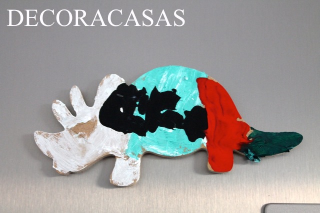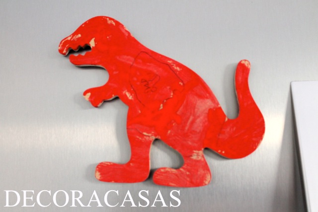 Este kit com dinossauros recortados em mdf com ímas no verso eu comprei em uma liquidação na Tok&Stok. Fizeram um sucessão entre as quatro mãozinhas arteiras daqui de casa.