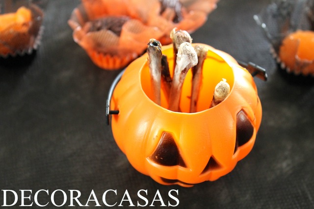Coloquei-os solenemente na mesa do bolo, dentro dos potinhos de abóbora.