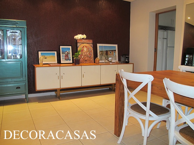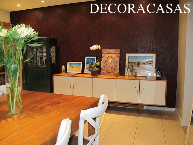 A sala de jantar é ampla e conta com um bom espaço para acomodar um bufê e uma cristaleira além da mesa de jantar. A parede principal do espaço já contava com uma textura cor de rosa.