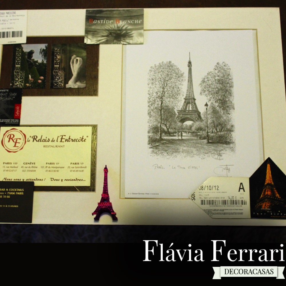 Quando viajo, sou daquelas que guarda todos os bilhetinhos e cartões dos lugares que passei e gostei para, se algum dia voltar ao lugar, recordar os bons momentos. Antigamente fazia álbuns de fotos completíssimos, porém agora deixo as fotos sem revelar (que feio) e concentro-me em fazer quadros com recordações como este, de Paris.