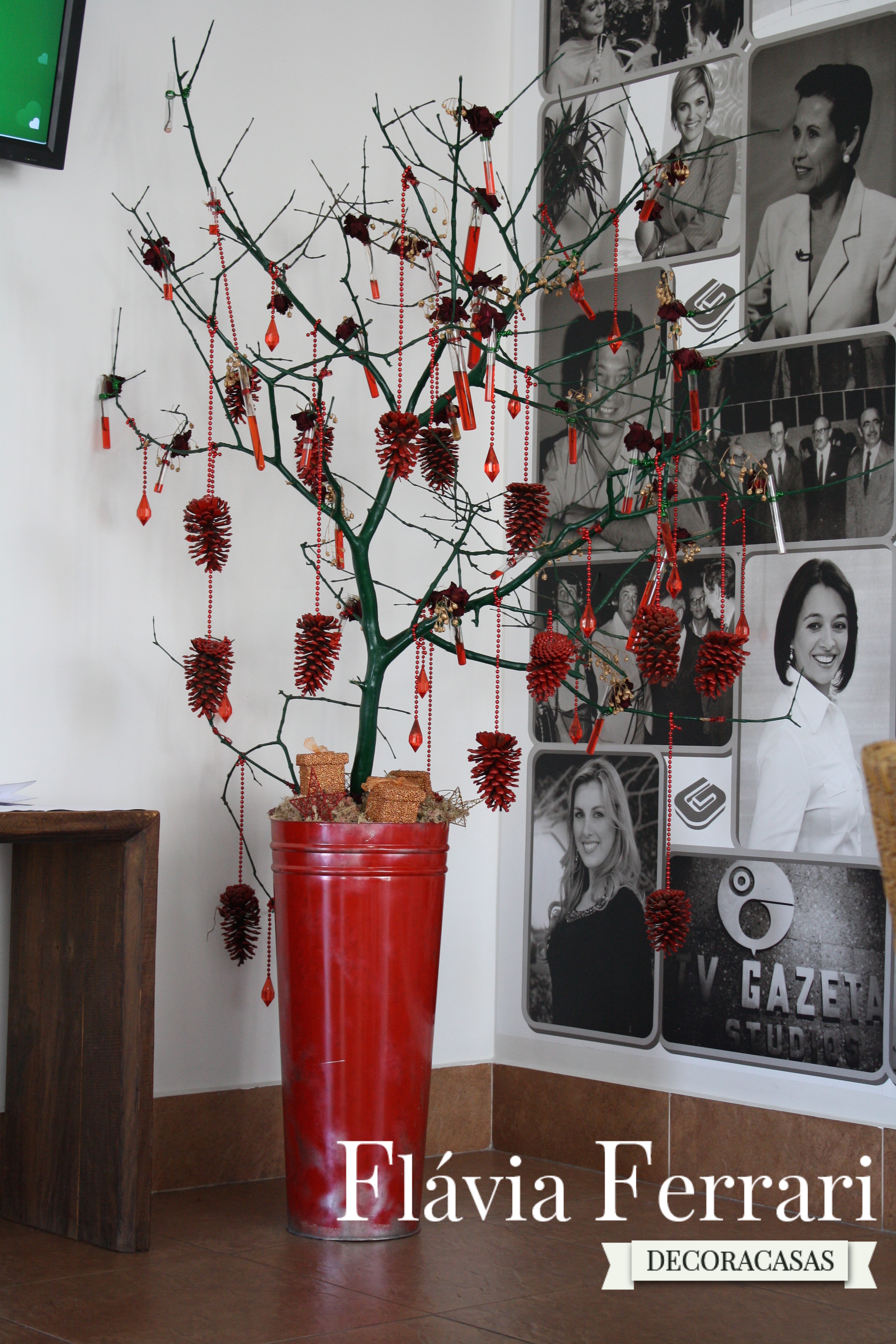 A árvore de Natal da TV Gazeta de vários anos atrás (quando eu ainda fazia o programa matutino com a Olga Bongiovanni e a Claudete Troiano, vejam bem!). Mas olhem que ideia bacana e fácil de replicar: um galho pintado de verde, adornado com enfeites vermelho (gosto muito dos arranjos com as pinhas pintadas e com os tubos de ensaio com líquido vermelho) colocado em um latão. Nada mais. Simples, singelo e de efeito.