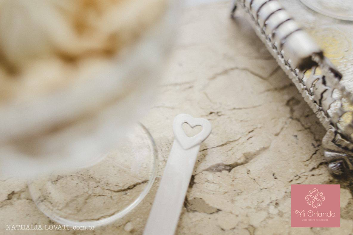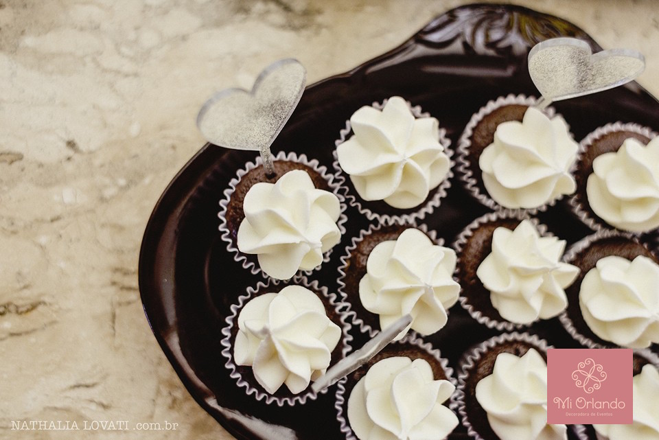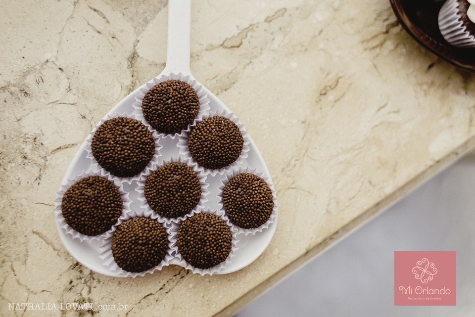 Agregar alguns símbolos nos objetos também deixa a mesa interessante. No caso o elemento foi o coração aparecendo na frigideira branca com os brigadeiros, no prato de vidro e nos toppers.