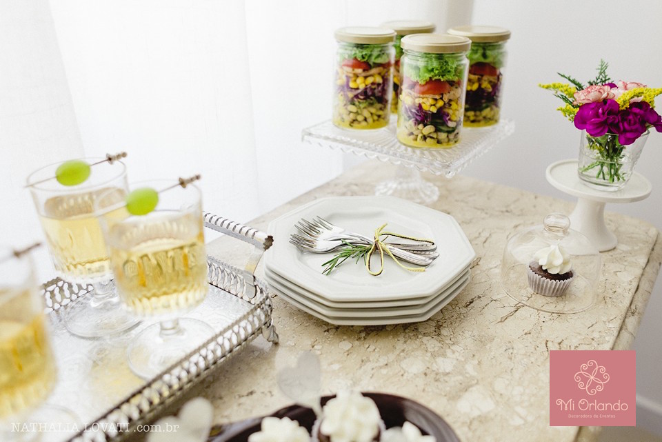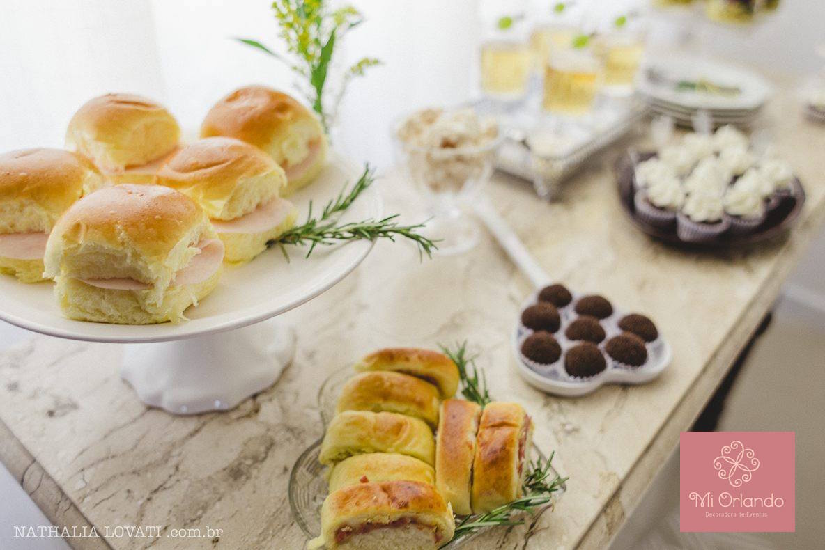 Para tanto escolhi pães saborosos, uma salada com combinação perfeita, suco de uva geladinho( poderia ser vinho, espumante) e doces( suspiros, cupcakes e brigadeiros). Todos práticos de forma que cada convidado pudesse se servir e permitir que a mãe ficasse relaxada e de fato se sentisse homenageada. Afinal ela é a estrela!